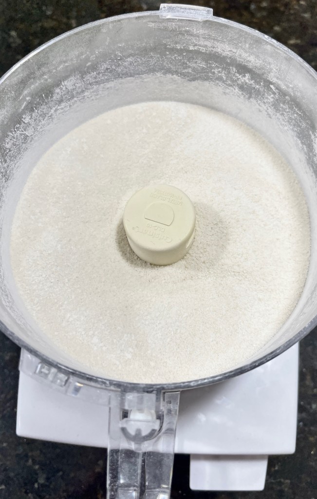 - Pour the sugar into the pood processor with the cutting attachment in, and run it for a minute or two.